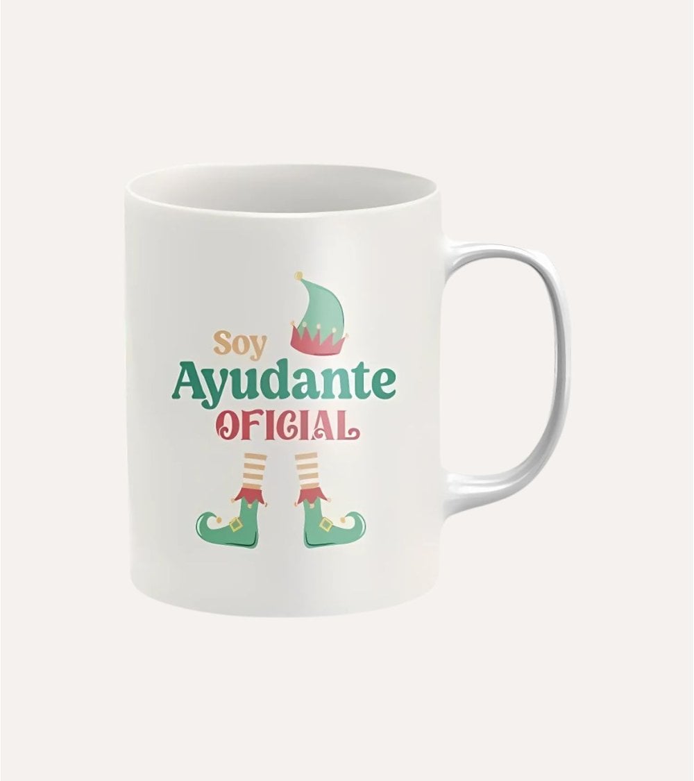 La taza está elaborada en cerámica blanca brillante, ofreciendo una superficie lisa y reflectante que realza sus detalles decorativosy el texto “Soy Ayudante Oficial” en colores rojo y verde vibrantes, acompañado por ilustraciones de piernas de duende con medias a rayas rojas y blancas en el reverso. Tiene una capacidad de 300 ml, ideales para disfrutar tu bebida caliente favorita durante los días fríos.