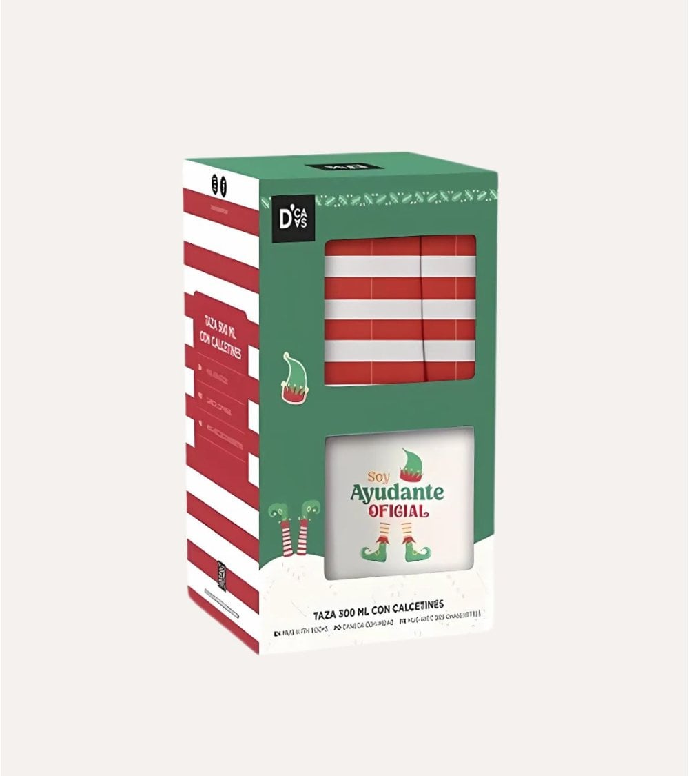 Complementando la taza , el set incluye un par de calcetines confeccionados en algodón suave y elástico. Los calcetines presentan un diseño clásico navideño con rayas horizontales rojas y blancas, rematados con puños verdes como un duende. Su tamaño estándar está pensado para adaptarse cómodamente a la mayoría de los pies adultos.