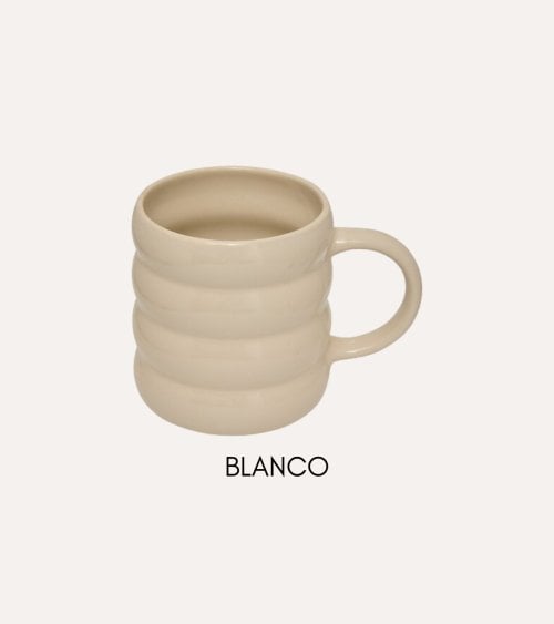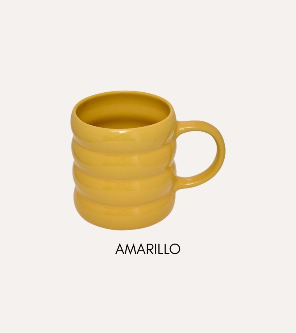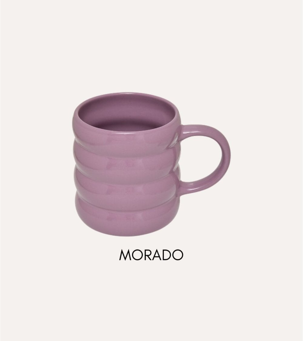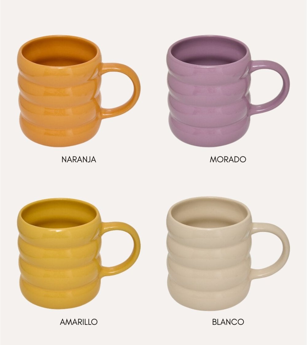 Cada taza presenta un cuerpo redondeado con pronunciadas estrías horizontales que no solo aportan textura visual sino también un agarre cómodo. Su asa robusta facilita el manejo, haciendo que cada sorbo sea una experiencia placentera. Además, su acabado brillante resalta los colores intensos, convirtiéndolas en piezas decorativas ideales para tu cocina o comedor.