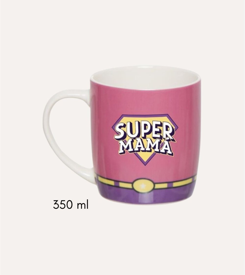 Esta Taza Mug para Super Mamá es el regalo perfecto para demostrarle cuánto la aprecias. Con una capacidad de 350 ml, es ideal para su café matutino o té de la tarde. Sus medidas son 8.3 x 8.3 x 10 cm, lo que la hace cómoda para sostener. Sorprende a tu mamá con esta taza que celebra su superpoder.