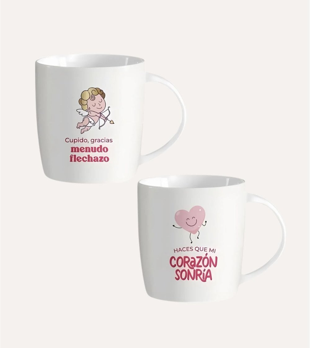 El color blanco predominante del mug le otorga una apariencia moderna y limpia, mientras que el acabado brillante no solo mejora su estética, sino que también facilita su limpieza. En uno de sus lados, encontrarás una ilustración juguetona de Cupido junto con el texto "Cupido, gracias menudo flechazo", todo en una tipografía divertida que evoca alegría y amor. En el lado opuesto, un adorable corazón sonriente acompaña la frase "Haces que mi corazón sonría", creando una conexión emocional perfecta para los enamorados.