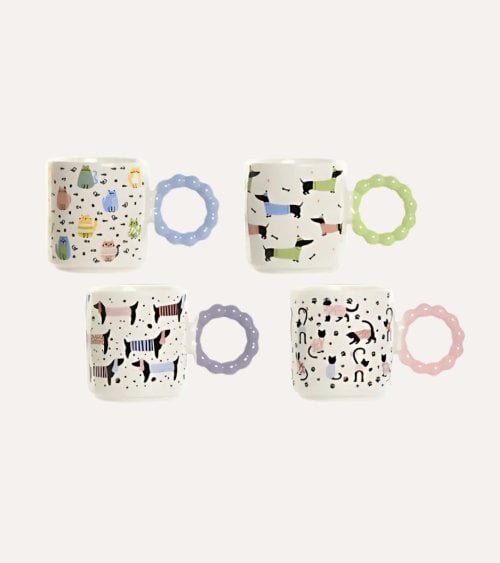 - Mug Superior Izquierdo: Presenta adorables ilustraciones de gatos y perros en colores vibrantes como azul, rosa y amarillo.