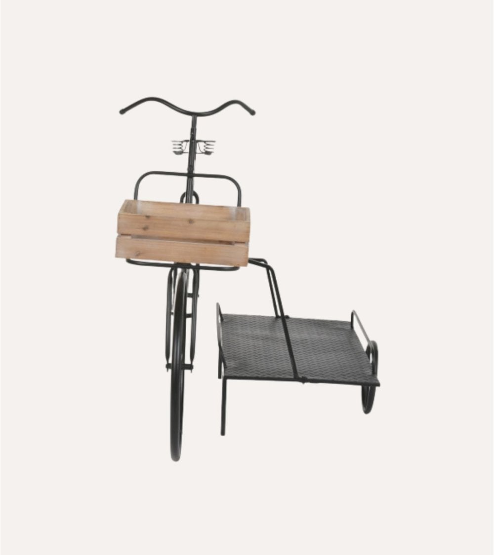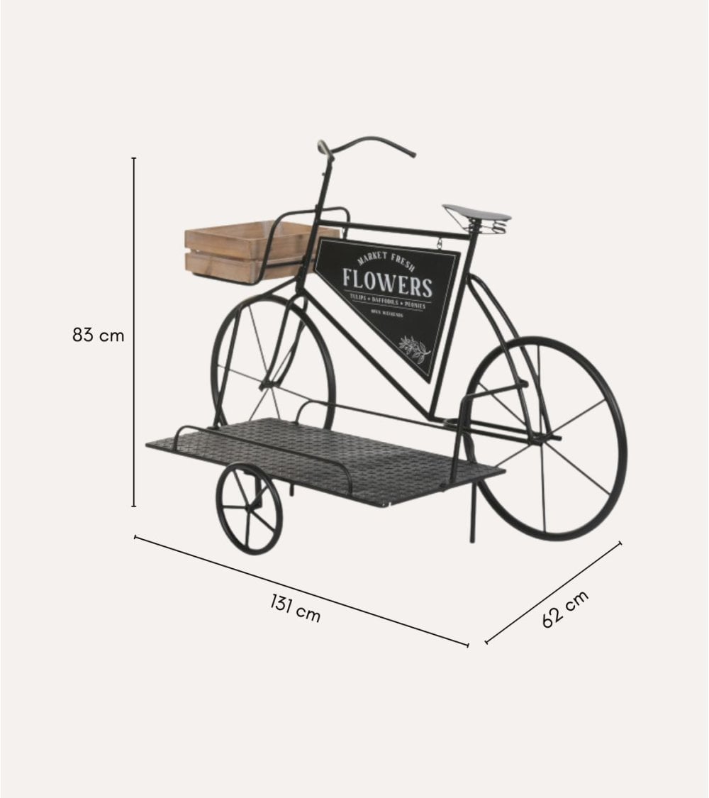 Diseñado como una bicicleta de mercado retro, este portamacetas incorpora un vistoso panel con el mensaje “MARKET FRESH FLOWERS”, perfecto para resaltar tus plantas naturales o artificiales, ramos secos o composiciones florales decorativas. Gracias a su diseño ligero pero estable, podrás colocarlo en la entrada de casa, en un escaparate comercial, en eventos especiales o como pieza central de un rincón verde interior.