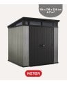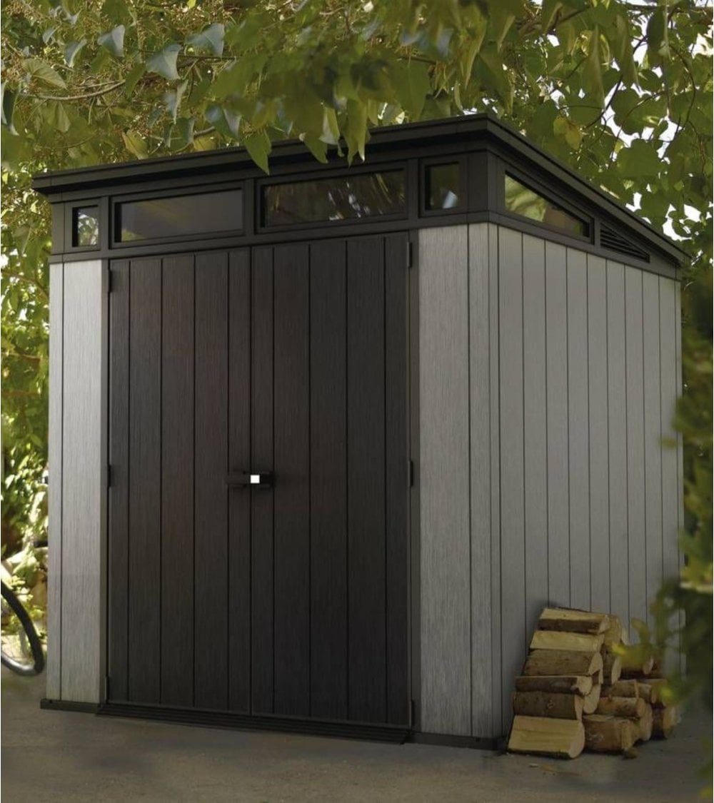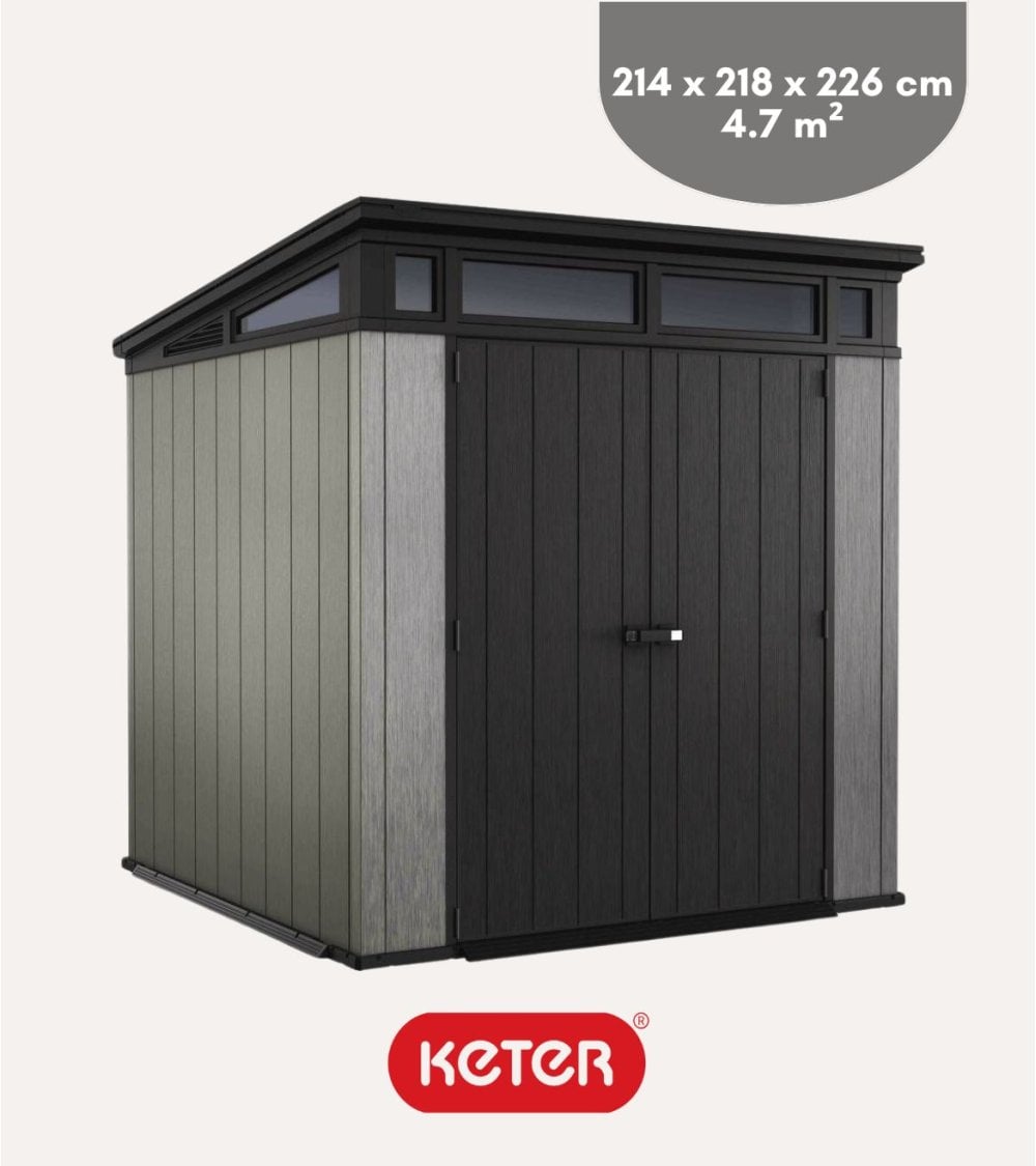 La Caseta para Exteriores Artisan para Jardín, con su diseño rectangular y techo plano, ofrece una estética minimalista que se adapta a cualquier decoración exterior. Su combinación de tonos gris claro y negro profundo resalta su modernidad y proporciona un contraste visual atractivo. Fabricada con resina y polipropileno resistentes a la intemperie, garantiza durabilidad a largo plazo. Sus dimensiones son 214 x 218 x 226 cm, con un interior de 201 x 201 x 219,8 cm. Cuenta con doble puerta de diseño vertical estriado, manija cuadrada minimalista, rejilla superior para ventilación y dos pequeñas ventanas para luz natural. Ideal para almacenar herramientas de jardín, muebles o leña.