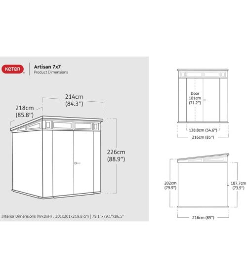 - Tamaño: 214 x 218 x 226 cm. Dimensiones internas: 201 x 201 x 219,8 cm.