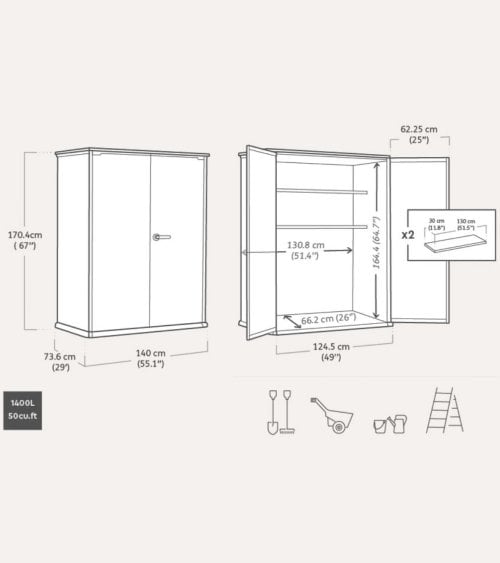 El Cobertizo para Exteriores High Store de Resina y Metal, con dimensiones de 140 x 73.6 x 170.4 cm y 1m2, es resistente a cualquier climatología y fácil de limpiar. Su color perdura con el tiempo y su montaje es sencillo. Ofrece 10 años de garantía y cuenta con un diseño Duotech que imita la estética y el tacto de la madera. A pesar de su resistencia de resina, se puede pintar a gusto.