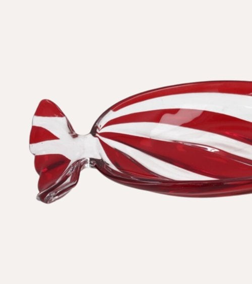 Esta bandeja está fabricada en vidrio de alta calidad, lo que le otorga una superficie lisa y brillante que refleja la luz, realzando sus colores vibrantes. Su forma alargada y ovalada imita perfectamente un caramelo envuelto, con detalles en los extremos que simulan los pliegues del envoltorio tradicional, aportando un aire divertido y sofisticado a cualquier espacio.