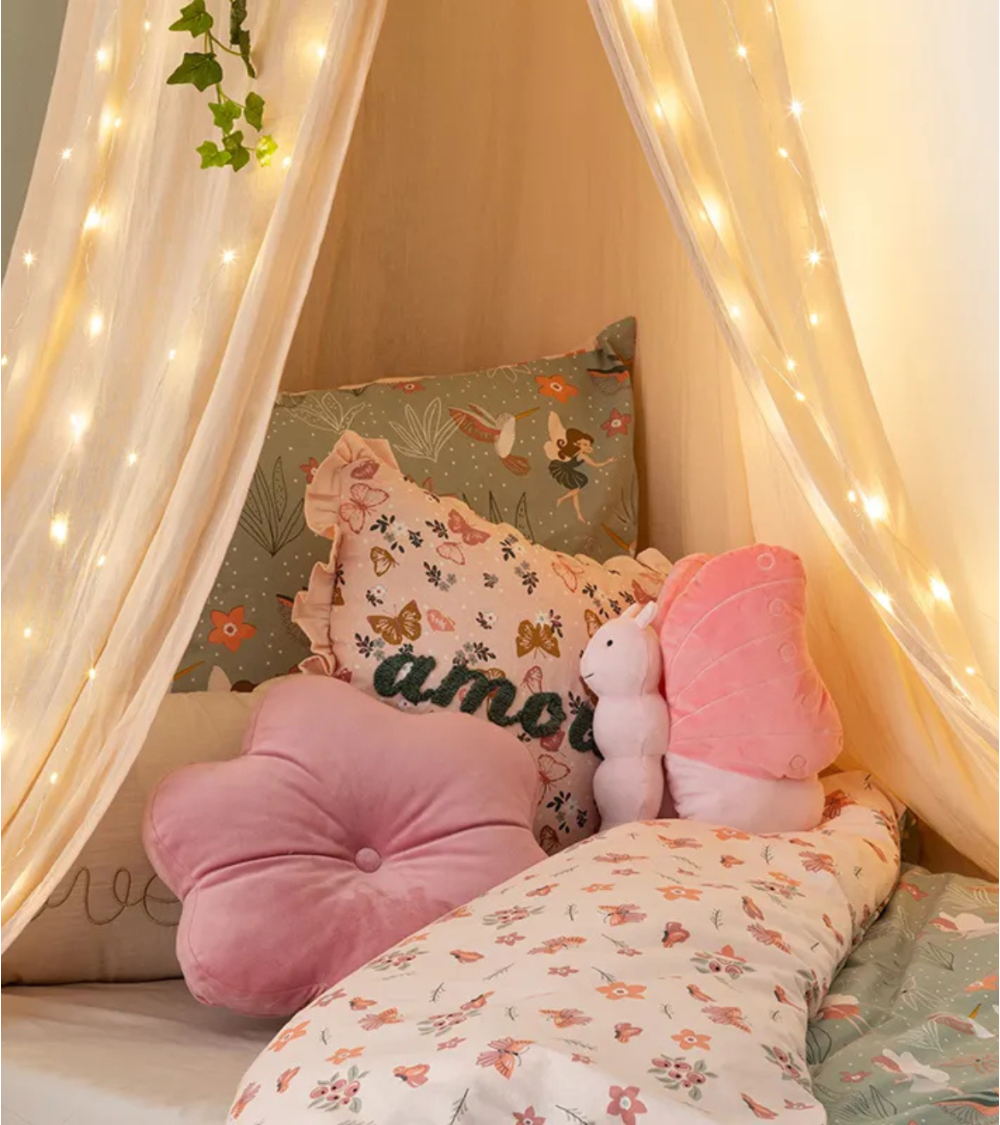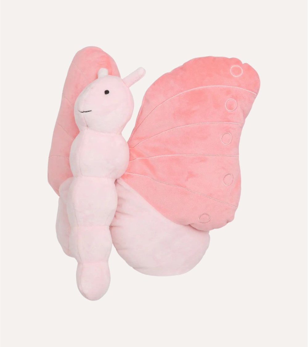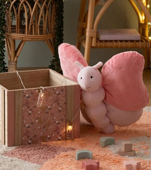 No solo es un juguete; el Peluche de Mariposa puede ser utilizado como elemento decorativo en la habitación o como parte del mobiliario infantil. Su estilo lúdico se integra perfectamente en habitaciones con decoración pastel o temática infantil, creando un ambiente acogedor y alegre.
