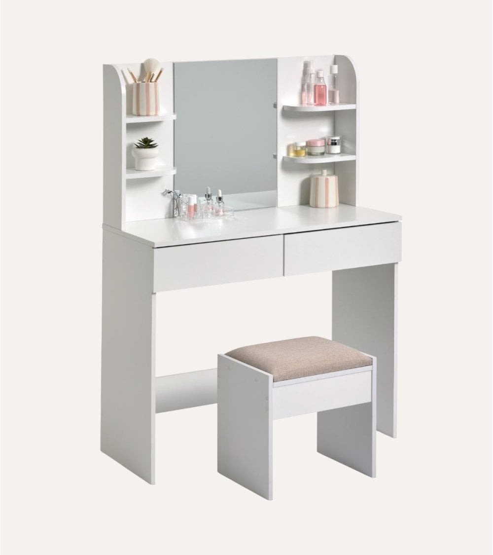 El conjunto incluye un cómodo taburete tapizado en tela beige clara que contrasta suavemente con la estructura blanca del tocador. Sus dimensiones compactas permiten guardarlo fácilmente bajo la mesa cuando no está en uso.