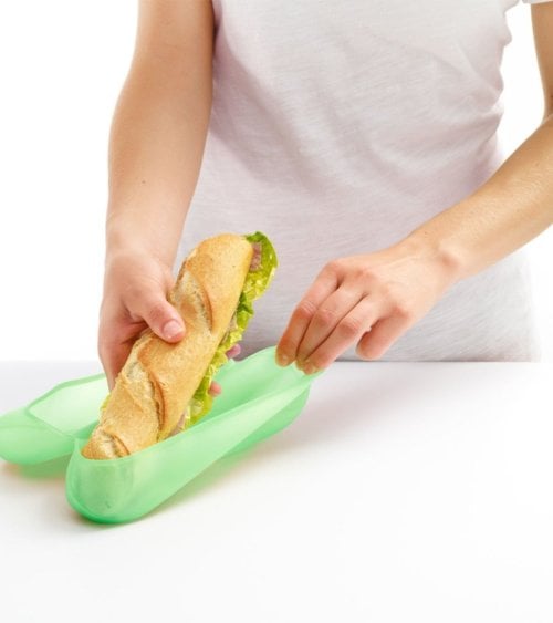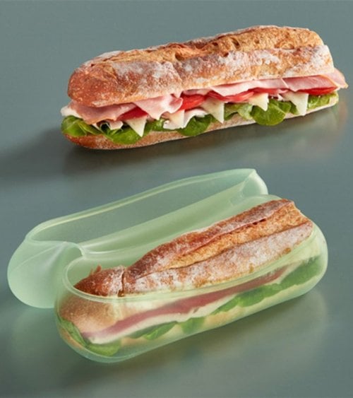 Descubre la Funda Envase para Bocadillo Reutilizable, un producto innovador de Lékué que transforma la forma en que llevas tus comidas. Con su diseño alargado y ovalado, este envase se asemeja a una cápsula aerodinámica, ideal para almacenar sándwiches y otros alimentos de manera compacta y práctica.