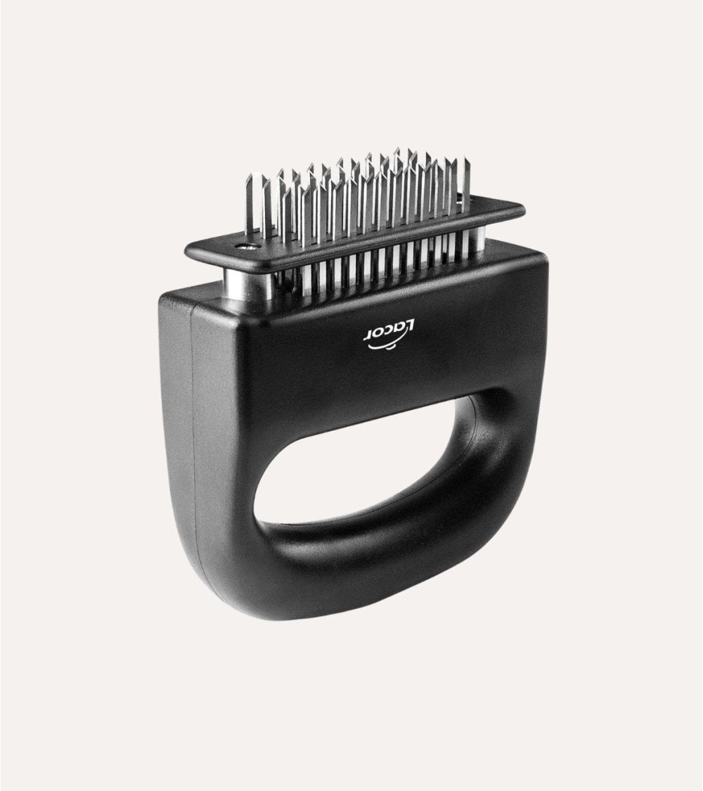 Gracias a sus cuchillas afiladas y distribuidas uniformemente, el ablandador penetra eficazmente las fibras del músculo, facilitando la cocción uniforme y logrando una carne más tierna y jugosa. Su tamaño compacto lo hace perfecto para almacenar sin ocupar mucho espacio en tu cocina.