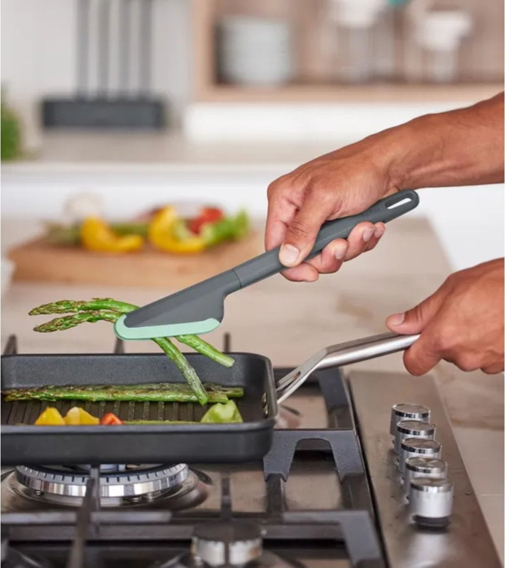 Con un diseño moderno y atractivo, las pinzas presentan un cuerpo en un elegante gris con acentos verdes vibrantes que no solo aportan estilo, sino que también mejoran la ergonomía. La forma alargada y triangular permite un agarre cómodo y seguro, mientras que los extremos contorneados aseguran que puedas manejar todo tipo de alimentos sin esfuerzo.