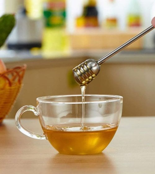- Palito mielero de acero inox: Su diseño único permite que la miel se deslice suavemente, evitando derrames y desperdicios.