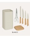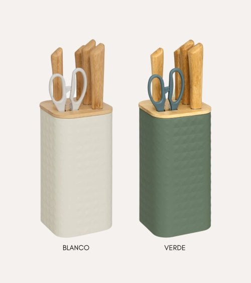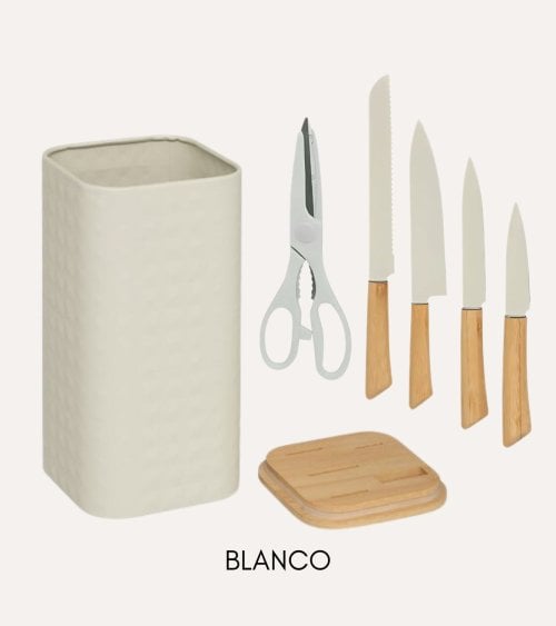 Cuchillos y Tijeras Incluidos: Dentro de cada bloque encontrarás varios cuchillos con mangos de madera en acabado natural. Además, se incluye un par de tijeras; una con mangos blancos y otra en azul teal, complementando perfectamente la paleta de colores del set.