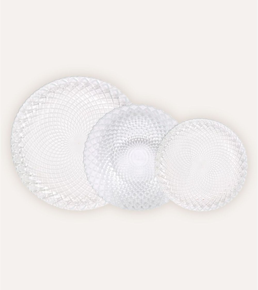 Cada pieza está diseñada con un patrón diamante único y texturizado, que no solo realza la belleza visual sino que también mejora el agarre, evitando deslizamientos al servir o apilar. Su acabado brillante permite que la luz se refracte delicadamente, creando un efecto luminoso que embellece tu presentación gastronómica.