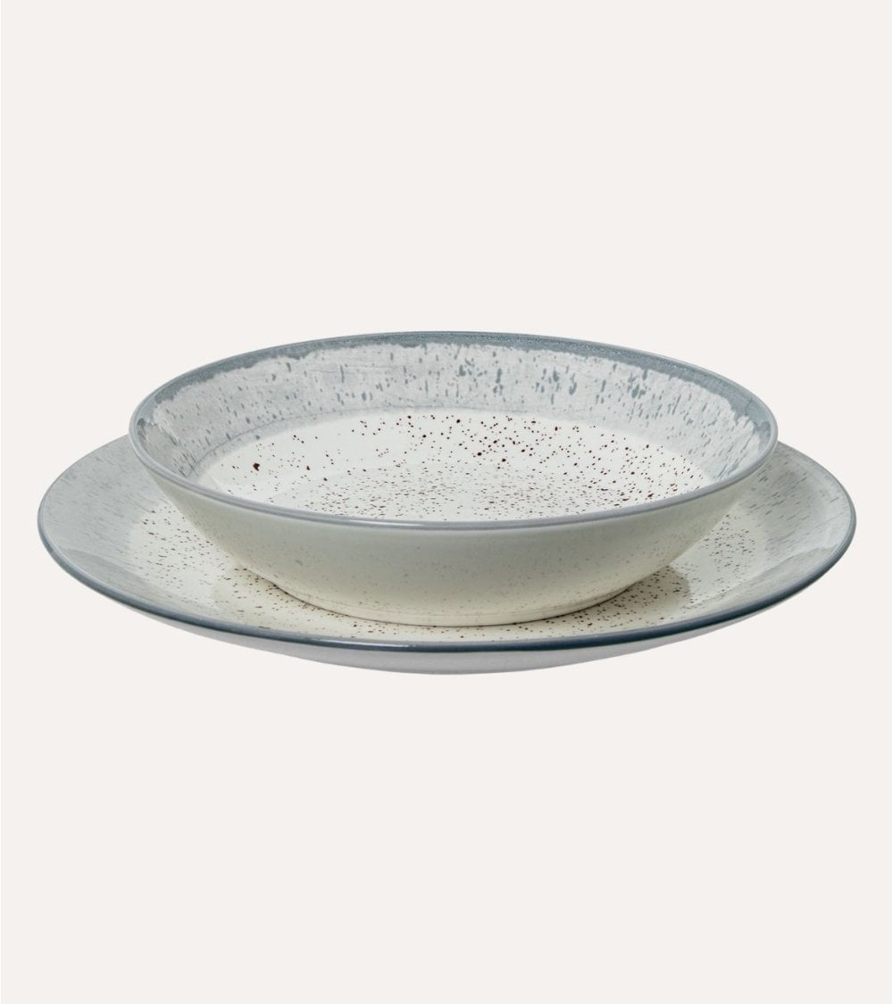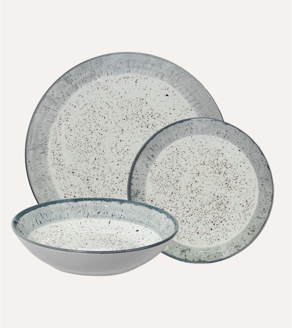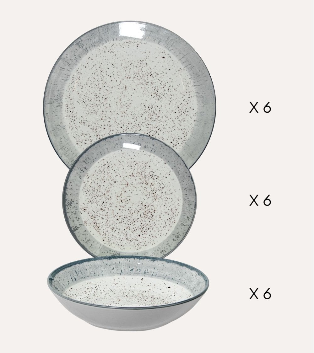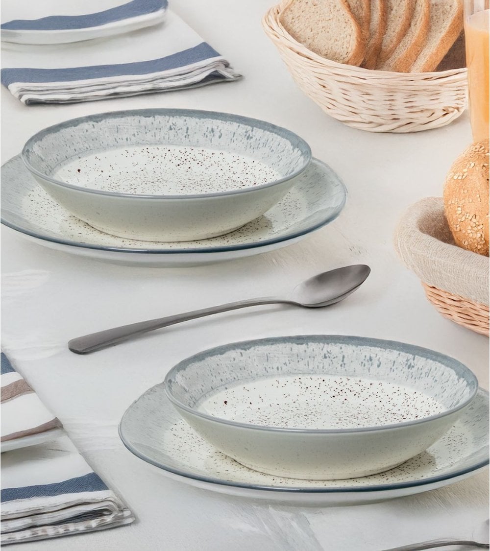 La vajilla está compuesta por porcelana de alta calidad, conocida por su durabilidad y apariencia elegante. Su paleta de colores suaves, que incluye tonos crema y un sutil borde azul-gris, aporta una atmósfera acogedora a tu mesa. Cada pieza presenta una superficie lisa con un acabado brillante y un patrón moteado que añade carácter a cada comida.