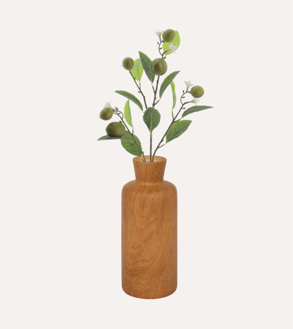 Esta pieza está elaborada con plástico y poliéster, materiales que garantizan resistencia y una apariencia auténtica. Es ideal para colocar en jarrones estándar o como parte de arreglos florales más complejos. Las hojas presentan diferentes tonos verdes, desde claros hasta oscuros, imitando perfectamente la naturaleza, mientras que las pequeñas flores o frutos en la punta añaden un detalle encantador.