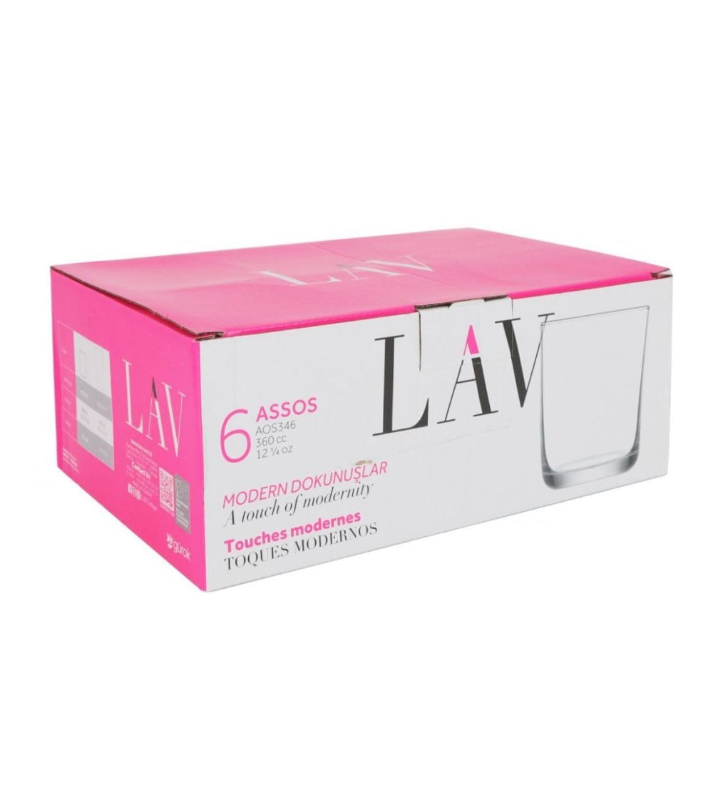 Este set de 6 vasos Assos de 360 ml es perfecto para cualquier ocasión. Hechos con materiales de alta calidad, estos vasos son duraderos y elegantes. Su diseño único y sofisticado los hace ideales para servir todo tipo de bebidas. Son fáciles de limpiar y aptos para lavavajillas. Este set es un complemento perfecto para tu hogar o un regalo ideal.