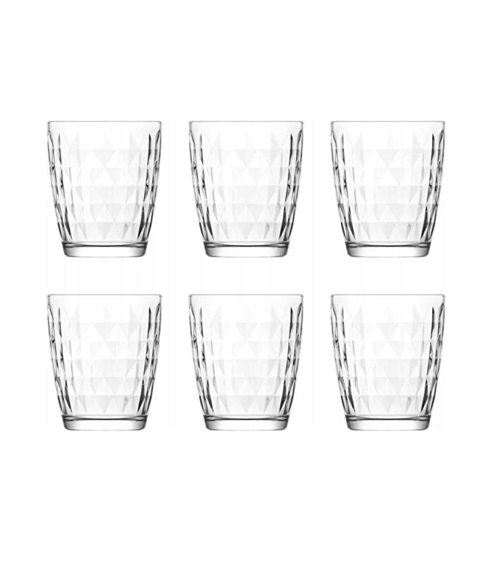Pack de seis vasos de cristal con un delicado acabado en relieve en forma de rombo o diamante.