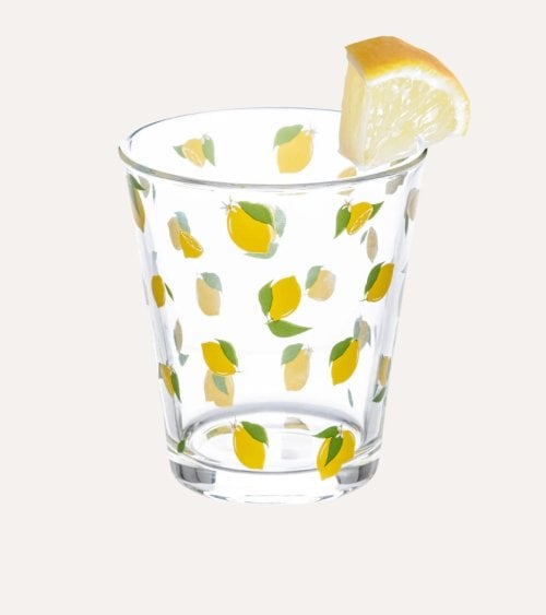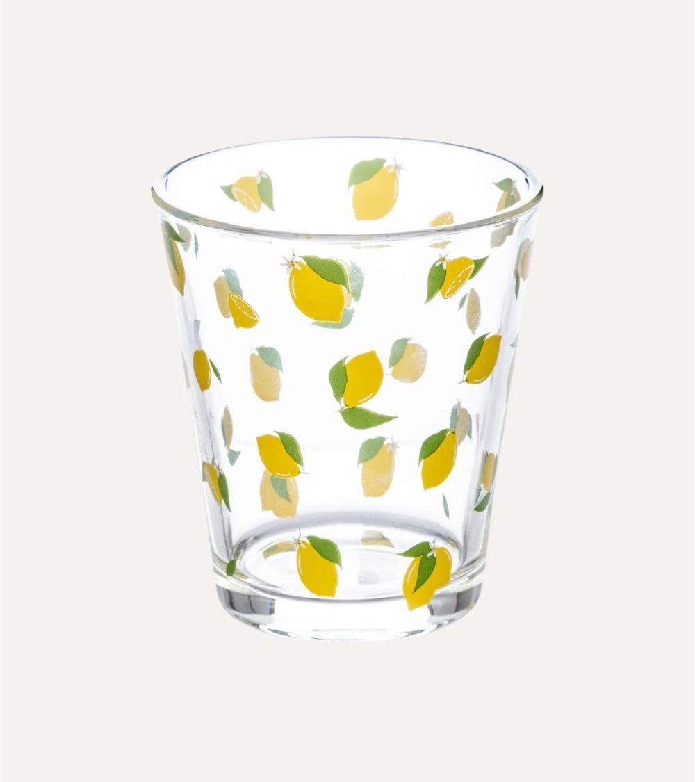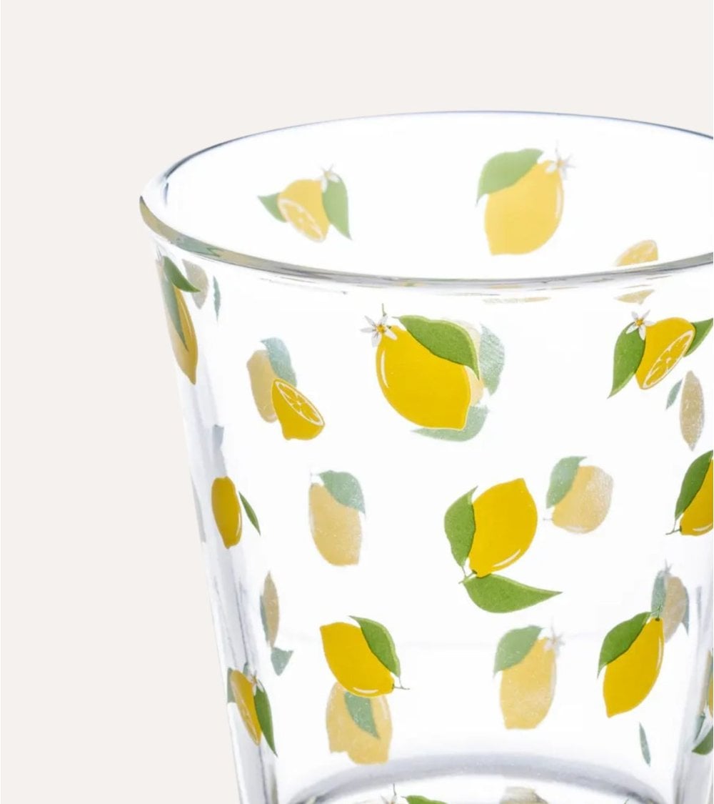 Fabricado en vidrio transparente, este vaso permite que la luz brille a través de su superficie, realzando los encantadores detalles del diseño. Las ilustraciones de limones en tonos amarillos brillantes, acompañadas por hojas verdes frescas, crean una estética veraniega que alegrará cualquier ambiente.