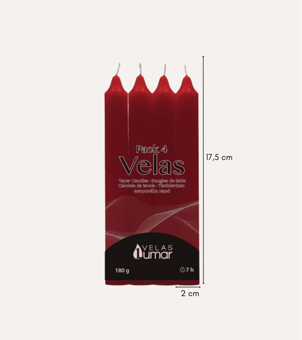 - Tamaño: Cada vela mide 2 x 17,5 cm.