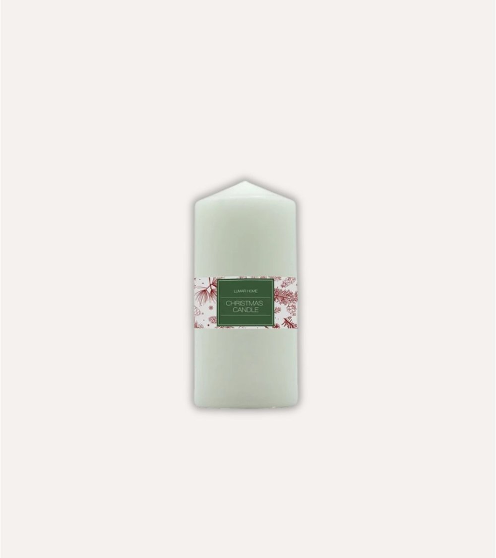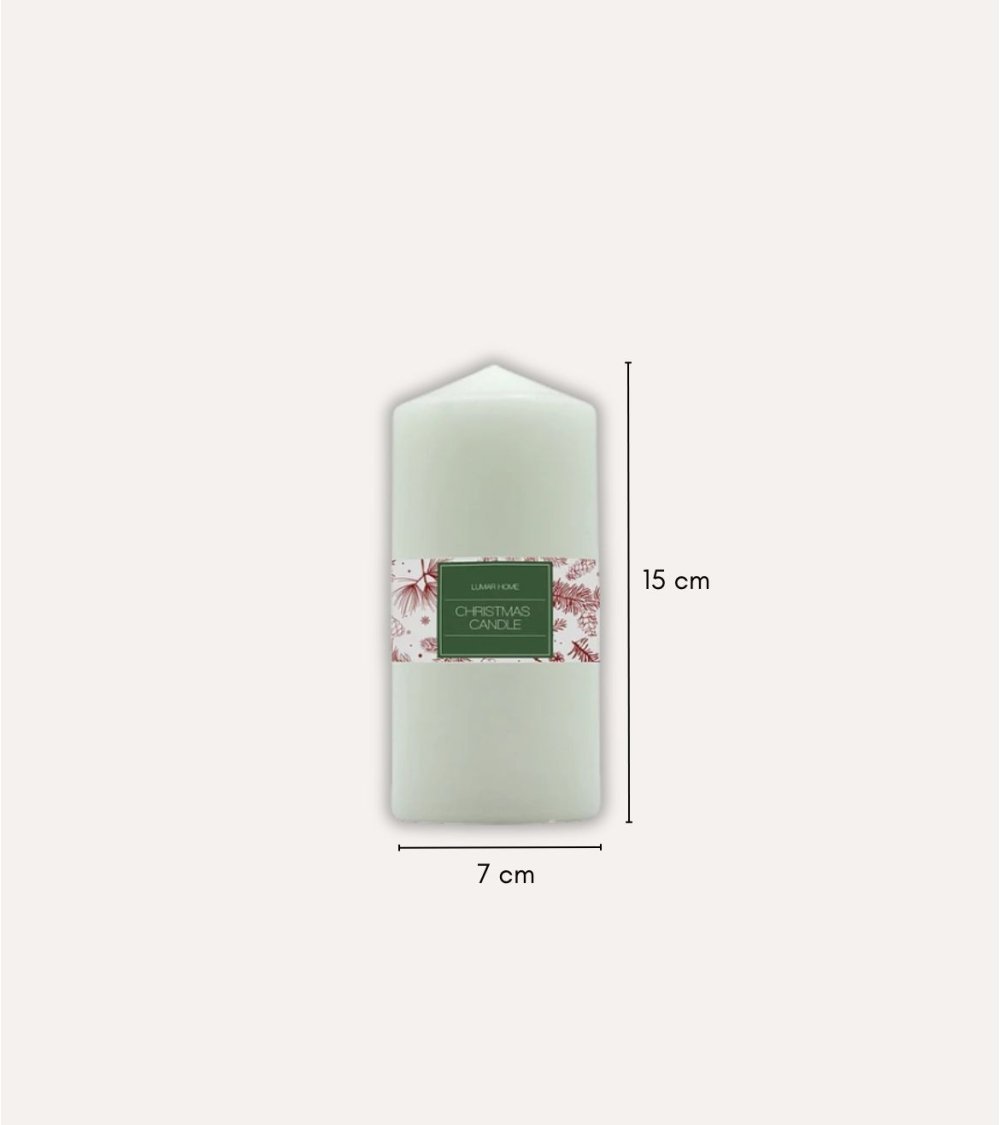 Disponible en dos tamaños prácticos, 10 cm y 15 cm, esta vela se adapta fácilmente a diferentes ambientes, desde mesas de centro hasta repisas o rincones especiales. Además, su diseño cilíndrico con una punta ligeramente afilada aporta un detalle elegante y distintivo que realza cualquier decoración navideña.