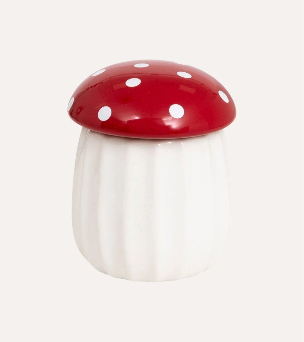 Su diseño inspirado en una seta, con una base blanca texturizada y una tapa roja con puntos blancos, añade un aire contemporáneo y divertido. Esta vela es perfecta para quienes buscan un detalle original que también ofrezca aromas agradables durante su uso.