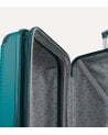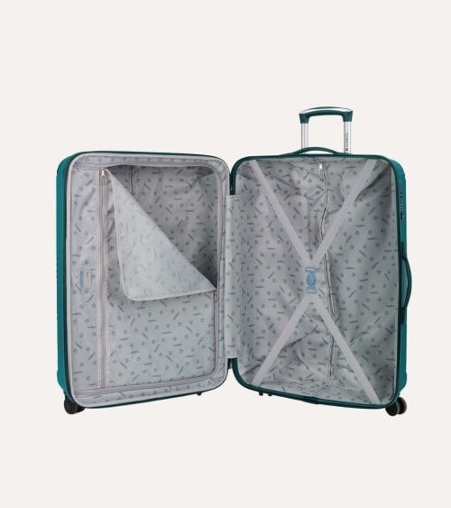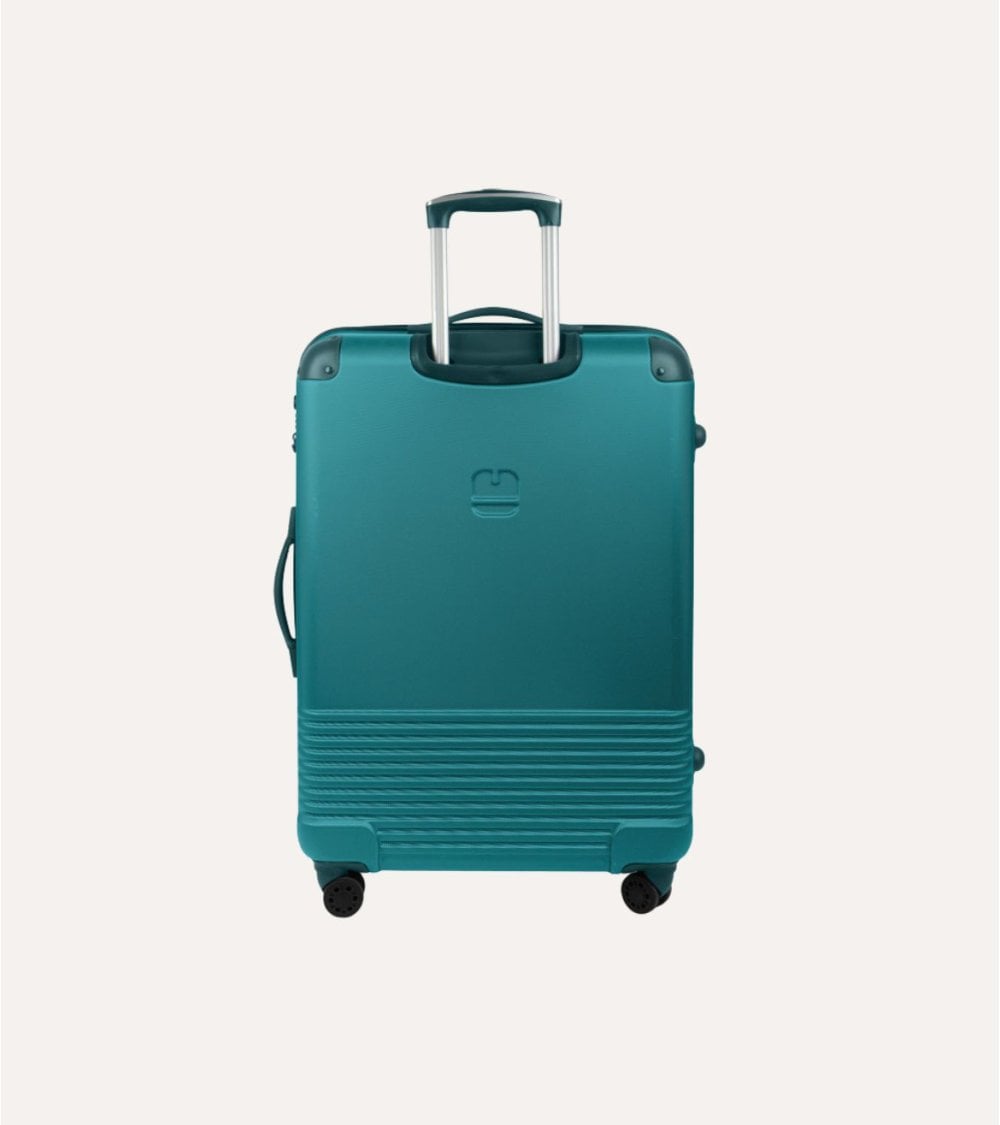 La maleta cuenta con un acabado en un elegante color azul profundo que no solo es atractivo a la vista sino también práctico gracias a su textura con estrías horizontales que minimizan los rasguños y mejoran el agarre. Su diseño incluye un Mecanismo de cierre seguro, con una cremallera resistente y un sistema de bloqueo que protege tus pertenencias durante el viaje.