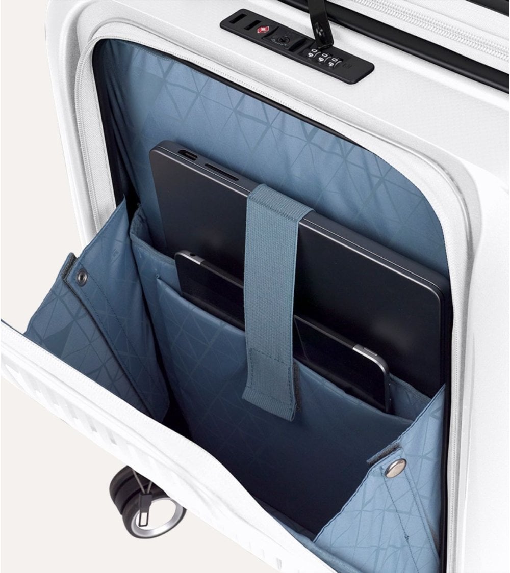 Materiales duraderos: Fabricada en polipropileno, la maleta ofrece una resistencia excepcional contra impactos y arañazos. Su exterior rígido protege sus pertenencias mientras que el interior suave, posiblemente forrado en un tejido acolchado azul claro, proporciona un entorno seguro para su laptop y otros dispositivos electrónicos.