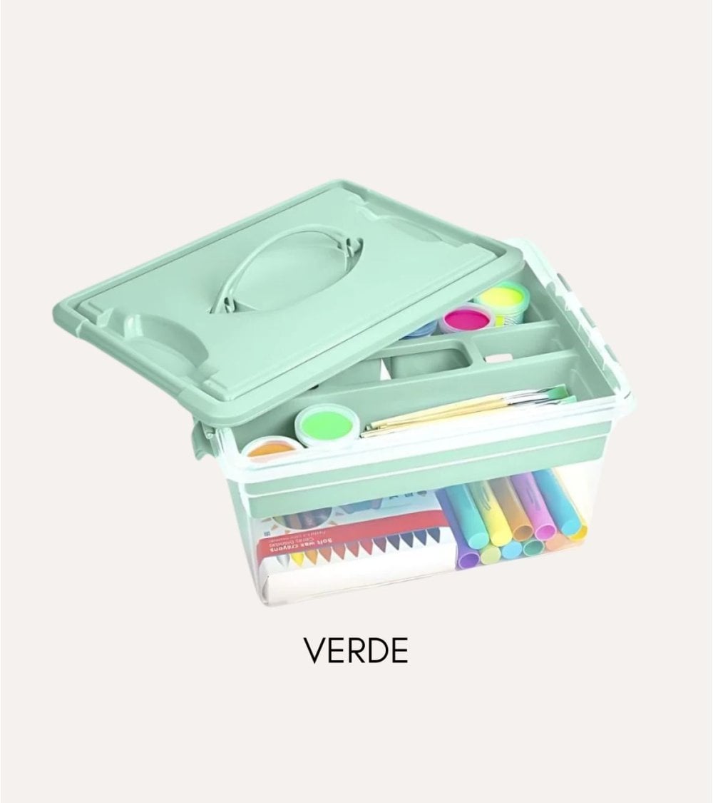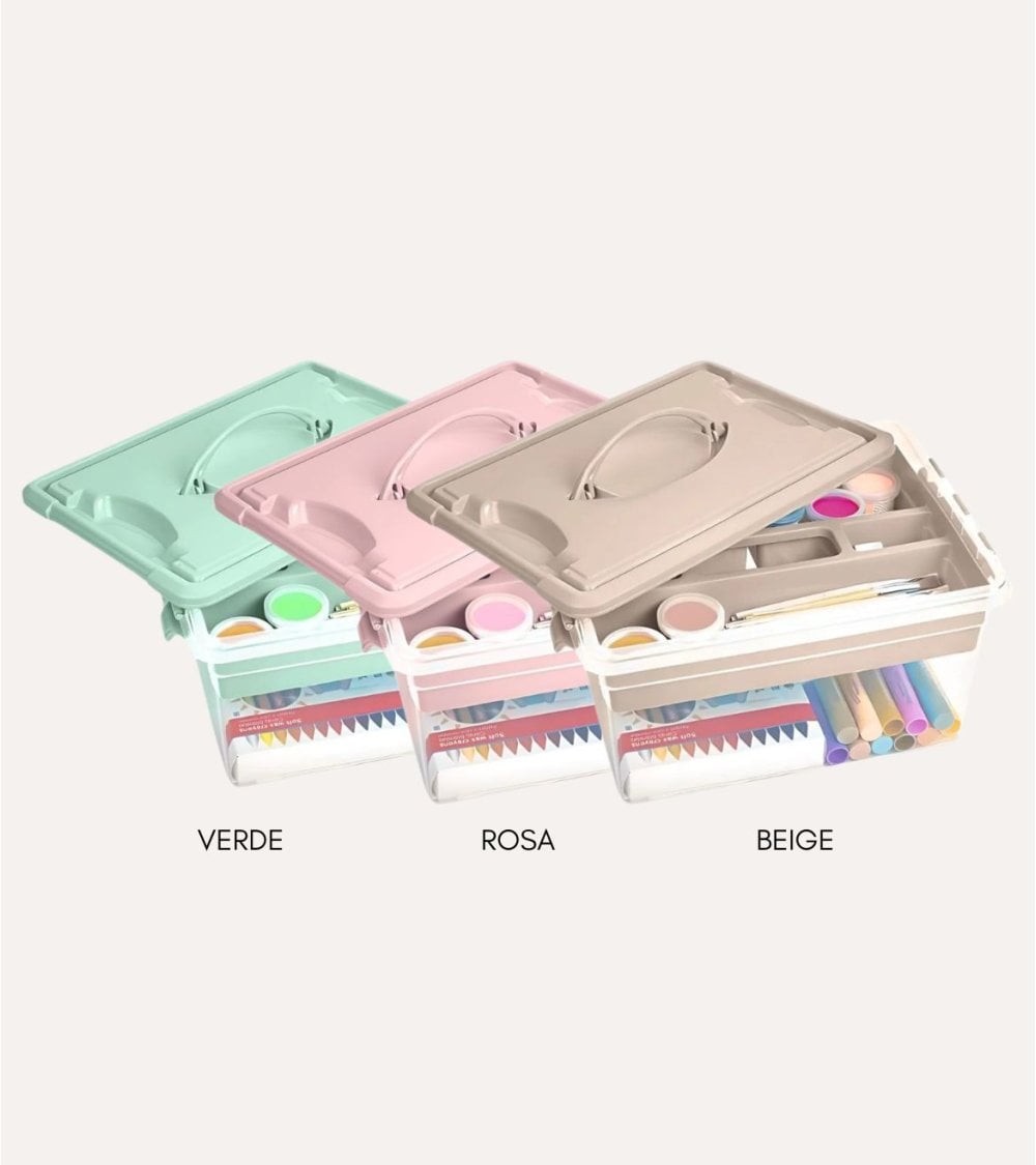 Esta caja con bandeja para ordenación es perfecta para mantener organizado tu material escolar. Con medidas de 34 x 27 x 18 cm, es ideal para guardar tubos de pintura, rotuladores y otros útiles. Disponible en colores verde, rosa y beige, se adapta a cualquier estilo y necesidad. Mantén tu espacio de trabajo limpio y ordenado con esta caja.
