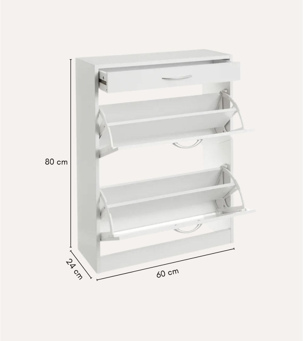 Fabricado en MDF de alta calidad, este zapatero ofrece una estructura resistente y duradera, perfecta para el uso diario. Su acabado en blanco brillante aporta un toque elegante y luminoso que se adapta fácilmente a cualquier decoración, desde pasillos hasta dormitorios u oficinas.