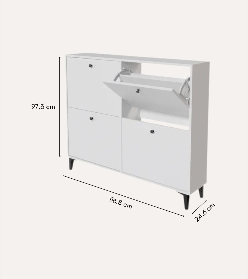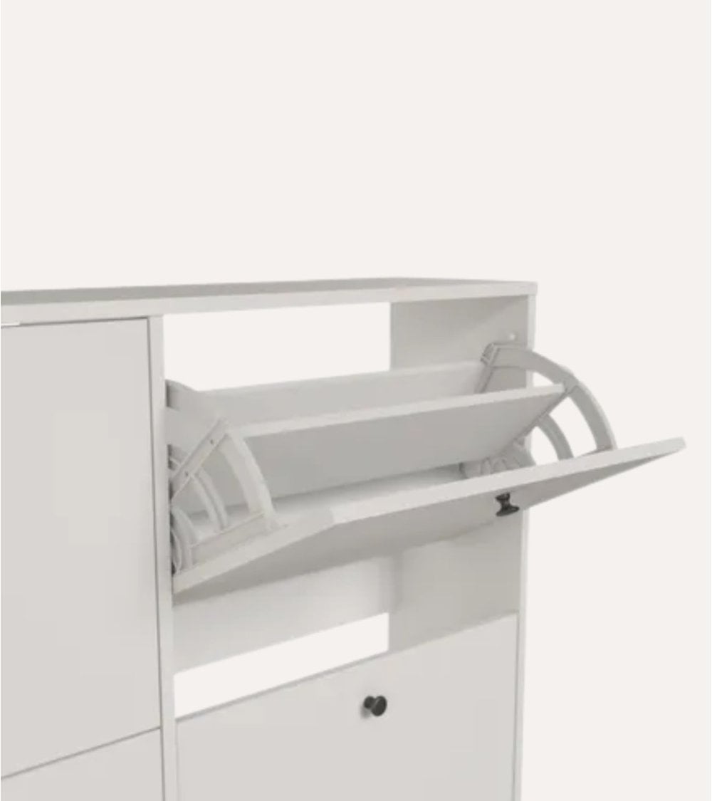 Gracias a sus 4 trampones abatibles, este zapatero permite almacenar numerosos pares de zapatos de forma vertical, aprovechando al máximo cada centímetro disponible. Su estructura en madera y melamina ofrece una superficie robusta, fácil de limpiar y muy resistente al uso diario, perfecta para familias activas o espacios con mucho tránsito. Además, su diseño de líneas limpias y acabado actual se integra con facilidad en diferentes estilos decorativos, desde ambientes minimalistas hasta interiores más clásicos.
