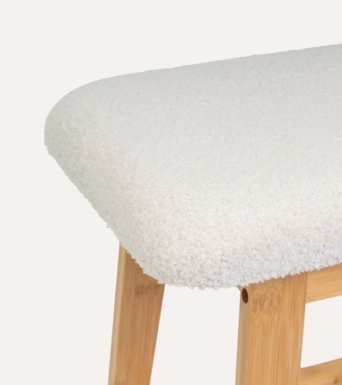 La parte superior del banco está acolchada y tapizada en un suave material que imita el borreguillo, ofreciendo una apariencia acogedora. El color crema o blanco roto del tapizado contrasta elegantemente con la estructura de bambú, creando un ambiente cálido y atractivo.